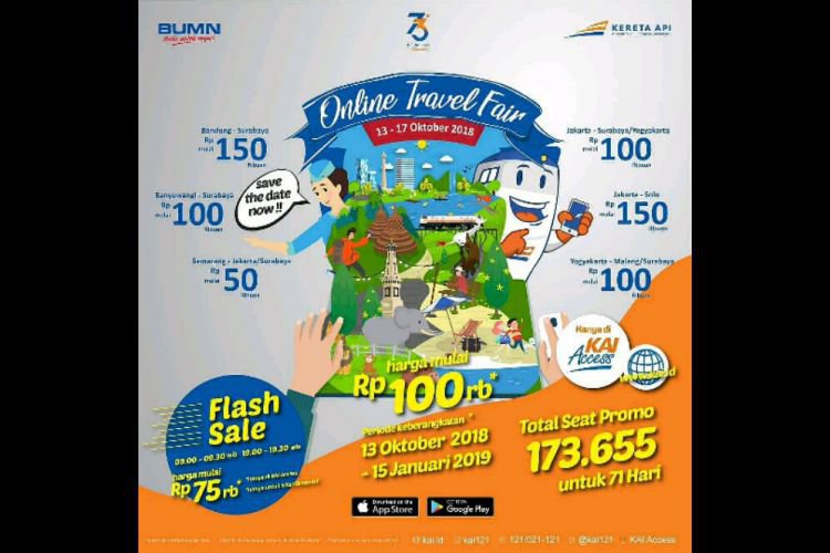 "Saya berharap, dengan adanya Promo KAI Online Travel Fair yang dimulai bagi pemesanan tiket KA pada tanggal 13 s/d 17 Oktober 2018 ini, dapat dimanfaatkan sebaik-baiknya oleh masyarakat, karena promo ini menghadirkan tarif kereta api dengan harga spesial murah," terangnya.