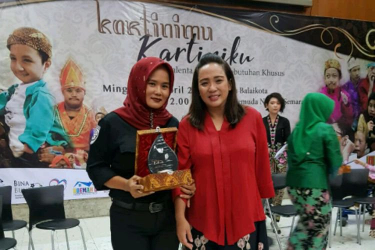 Sri Suprihatinah berfoto bersma Tia Hendi usai menerima penghargaan.. ©2016 Merdeka.com