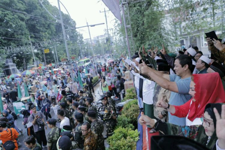 "Alhamdulillah kondusivitas terus terjaga baik, meskipun kemarin ada yang coba utak-atik, tapi semua sedulur-sedulur (saudara-saudara) tidak bergeming sama sekali dan siap menjaga keguyuban," seru Wali Kota Hendi. "Siapa yang tawaduk bersama Pak Kiai?" pekik Hendi yang langsung disambut gemuruh sekitar 50 ribu muslimin dan muslimat NU yang hadir.