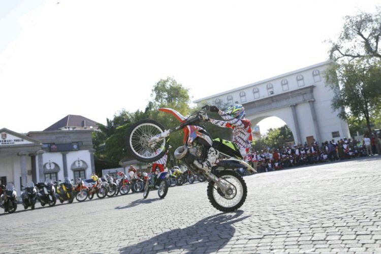Aksi para freestyler dalam kegiatan pemanasan bertajuk "Rolling Thunder," pra event MXGP yang digelar di Balai Kota Semarang, Kamis (5/7).. ©2016 Merdeka.com