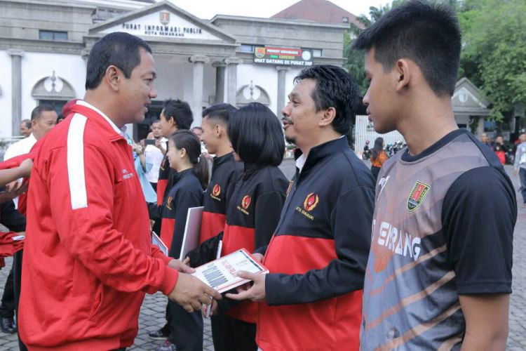 Wali Kota Hendi menyerahkan tali asih kepada atlet Porprov Kota Semarang peraih medali di halaman Balai Kota Semarang, Rabu (13/3).. ©2016 Merdeka.com