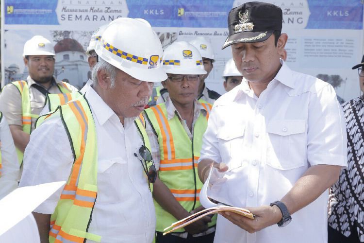 Wali Kota Hendi berbincang dengan Menteri PUPR Basuki, saat meninjau infrastruktur di Kota Semarang, belum lama ini.. ©2016 Merdeka.com