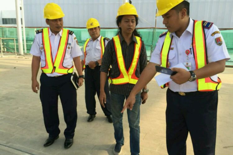 Kepala BLU Trans Semarang Ade Bhakti menunjuk titik-titik yang akan dipasang shelter BRT di terminal baru Bandara Ahmad Yani Semarang.. ©2016 Merdeka.com