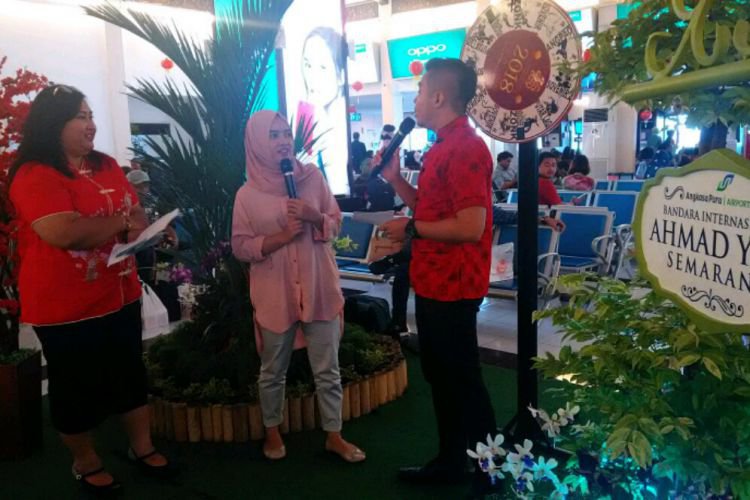 Calon penumpang pesawat di Bandara Internasional Ahmad Yani Semarang mengikuti kuis dan game yang digelar untuk memperingati Imlek, Jumat (16/2).. ©2016 Merdeka.com