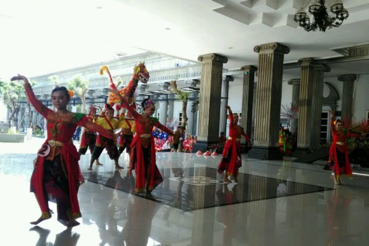 Para peserta lomba Tari Warak Ngendog menampilkan tarian di hadapan juri di Balai Kota Semarang, Selasa (8/5).. ©2016 Merdeka.com