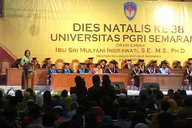 Menteri Keuangan Sri Mulyani Indrawati saat memberikan orasi ilmiah pada Dies Natalis ke-38 UPGRIS. Selasa (23/7).. ©2016 Merdeka.com