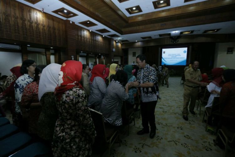 Wali Kota Semarang Hendrar Prihadi menyalami anggota Tim Penggerak PKK Kota Semarang dalam acara halal bihalal di Balai Kota Semarang, Senin (9/7).. ©2016 Merdeka.com