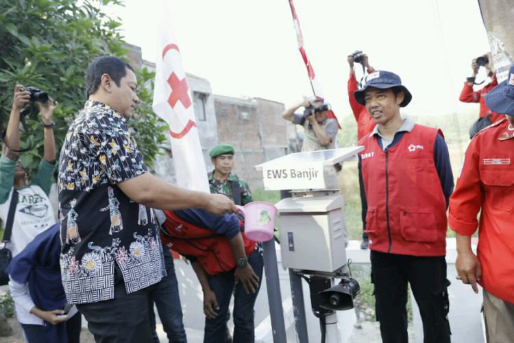Wali Kota Semarang Hendrar Prihadi memasang alat mitigasi bencana yang diberikan oleh American Red Cross, Senin (30/7).. ©2016 Merdeka.com