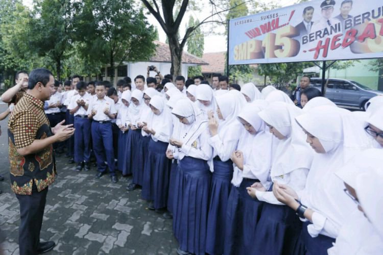 Wali Kota Semarang Hendrar Prihadi memimpin doa di depan siswa yang akan melaksanakan Ujian Nasional.. ©2016 Merdeka.com