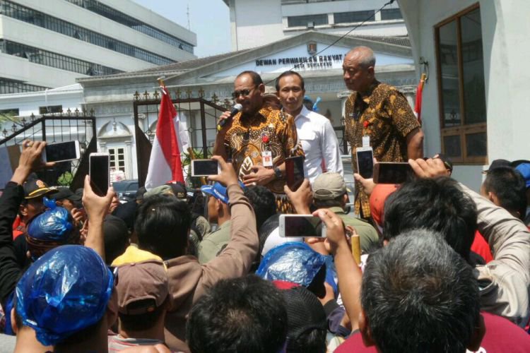 Pj Sekda Kota Semarang Agus Riyanto memberikan pengarahan kepada pedagang Pasar Kobong yang melakukan protes penolakan di Balai Kota Semarang, Kamis (3/5).. ©2016 Merdeka.com