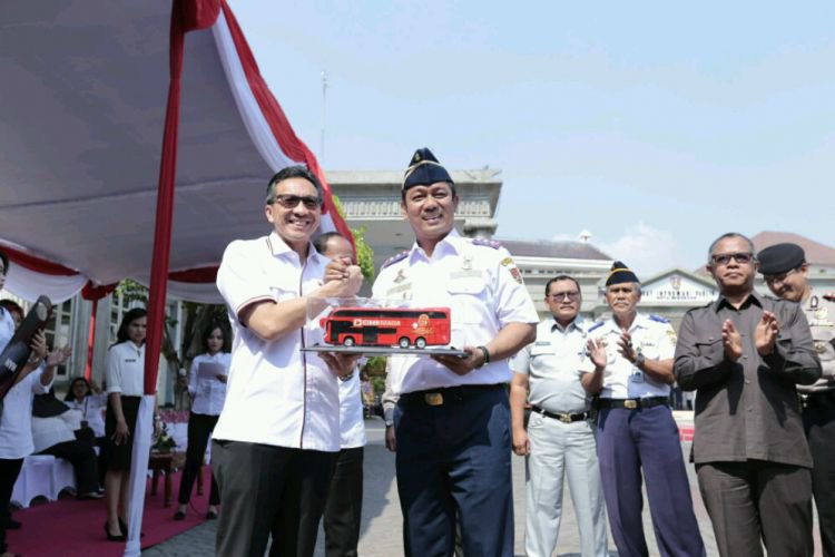 Wali Kota Semarang Hendrar Prihadi menerima replika bus tingkat Si Denok dari Presiden Direktur CIMB Niaga, Tigor M Siahaan.. ©2016 Merdeka.com