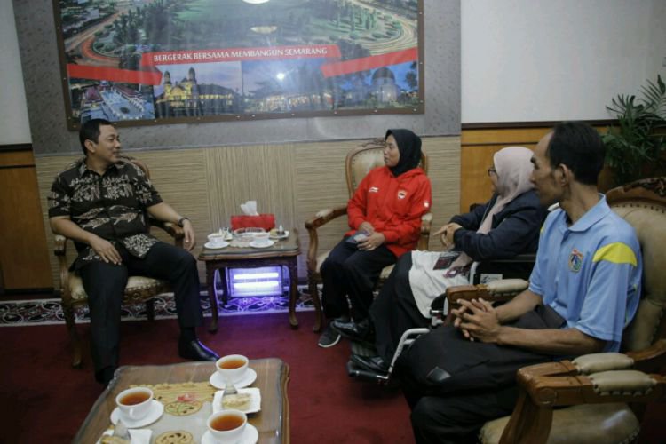 Wali Kota Semarang Hendrar Prihadi berbincang dengan Dian Krisnaningsih, atlet asal Kota Semarang yang berhasil menyumbangkan medali bagi Indonesia di ajang Asian Para Games 2018.. ©2016 Merdeka.com