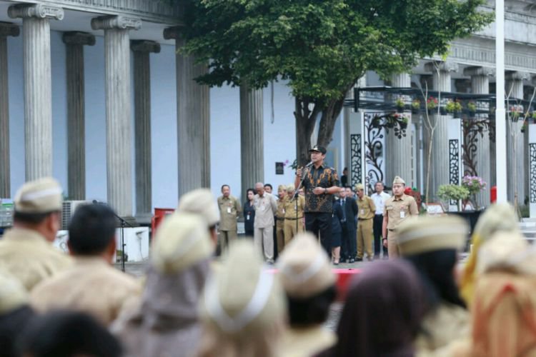 Wali Kota Semarang Hendrar Prihadi memimpin upacara di halaman Balai Kota Semarang, Senin (29/1).. ©2016 Merdeka.com