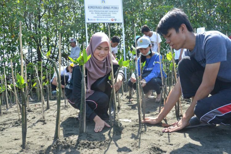 Merdeka.com, Semarang - Universitas Dian Nuswantoro (Udinus) Semarang mengajak seluruh mahasiswa baru (Maba) untuk mencintai lingkungan dengan cara mengajak mereka melakukan penanaman mangrove (bakau).