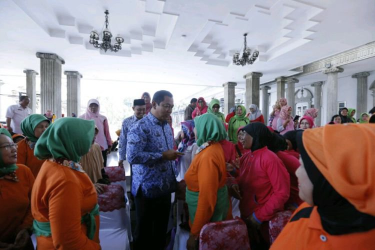 Wali Kota Semarang Hendrar Prihadi bercengkrama dengan para Lansia dalam acara lomba senam Lansia di Balai Kota Semarang, Rabu (25/4).. ©2016 Merdeka.com