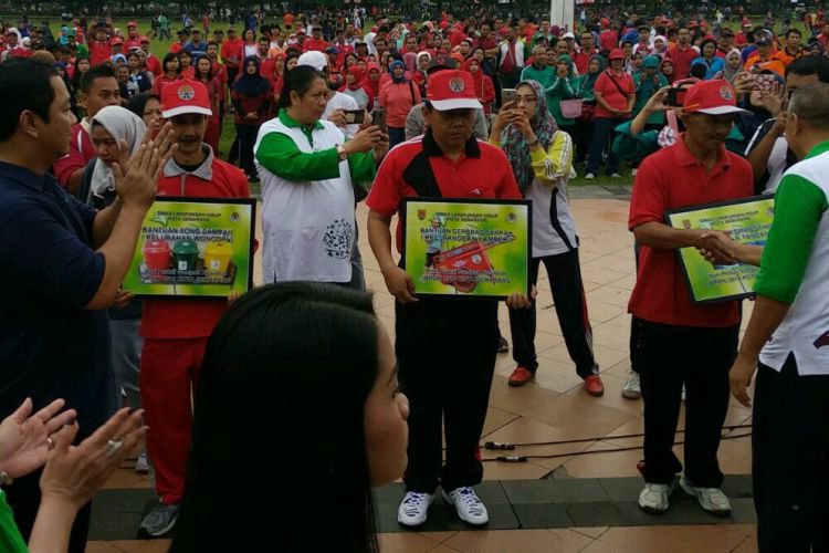 Wali Kota Hendi memberikan tepuk tangannya kepada warga yang menerima bantuan gerobak sampah dari Dinas Lingkungan Hidup Kota Semarang di Simpang Lima, Minggu (25/2).. ©2016 Merdeka.com