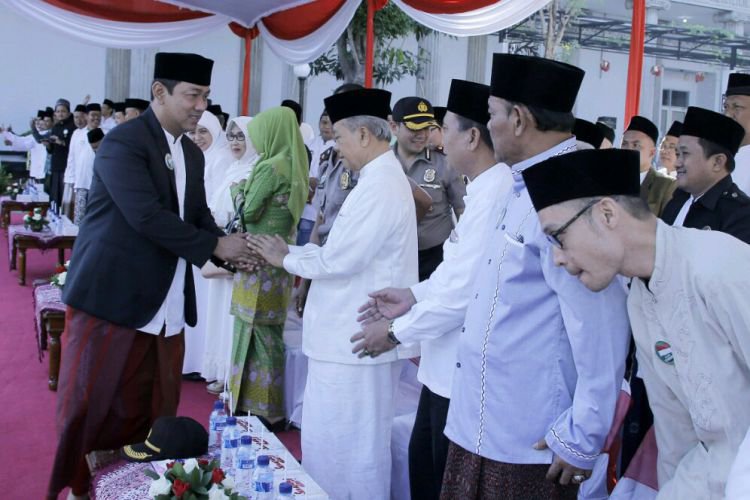 Wali Kota Semarang Hendrar Prihadi menyalami pimpinan Ponpes dan ulama usai upacara peringatan Hari Santri Nasional tingkat Kota Semarang di Halaman Balai Kota, Minggu (21/10).. ©2016 Merdeka.com