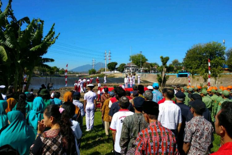 Meski digelar sederhana, namun upacara bendera di tengah sungai itu berjalan sangat khidmat. Berada di tengah sungai yang dijadikan pemecah air, upacara digelar dengan diikuti ratusan peserta, baik anak-anak maupun orang dewasa, dari aparatur kelurahan, TNI/Polri, Linmas serta beberapa petugas dari BBWS Pemali-Juwana.