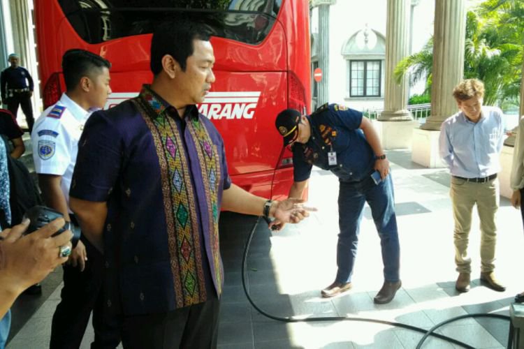 Wali Kota Semarang Hendrar Prihadi menyaksikan uji emisi BRT yang telah melakukan konversi bahan bakar dari solar ke gas di Balai Kota Semarang, Selasa (24/7).. ©2016 Merdeka.com